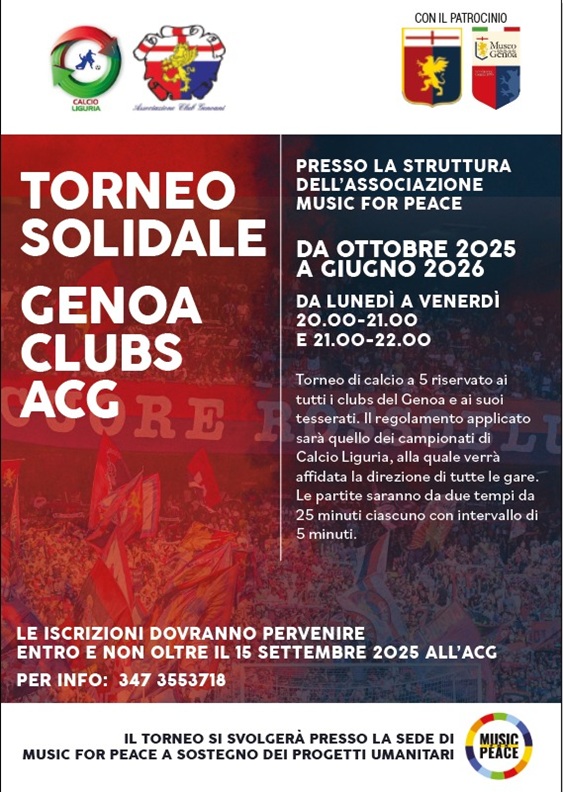Giocare a calcio, fare del bene. Vivere i colori rossoblù. Nasce sotto i migliori auspici la prima edizione del Torneo Solidale tra Genoa Clubs, rigorosamente iscritti all’Associazione Club Genoani, in programma sul campo di via Balleydier, nelle adiacenze della sede di Music For Peace, a pochi metri dalla lanterna. Sarà una lunga ‘maratona’ di football, quella riservata ai 100 e passa club presenti nella mappatura del tifo, con partite di due tempi da 25 minuti. Una parata, un dribbling, un gol. Ma soprattutto un modo per andare incontro a un atto di generosità, tuffandosi dentro un mare di genoanità, per supportare le campagne umanitarie di cui Music for Peace si fa portabandiera in varie parti del mondo. In passato la tifoseria aveva sposato la causa di MFP organizzando diverse raccolte allo stadio di generi alimentari. United in the name of Genoa.