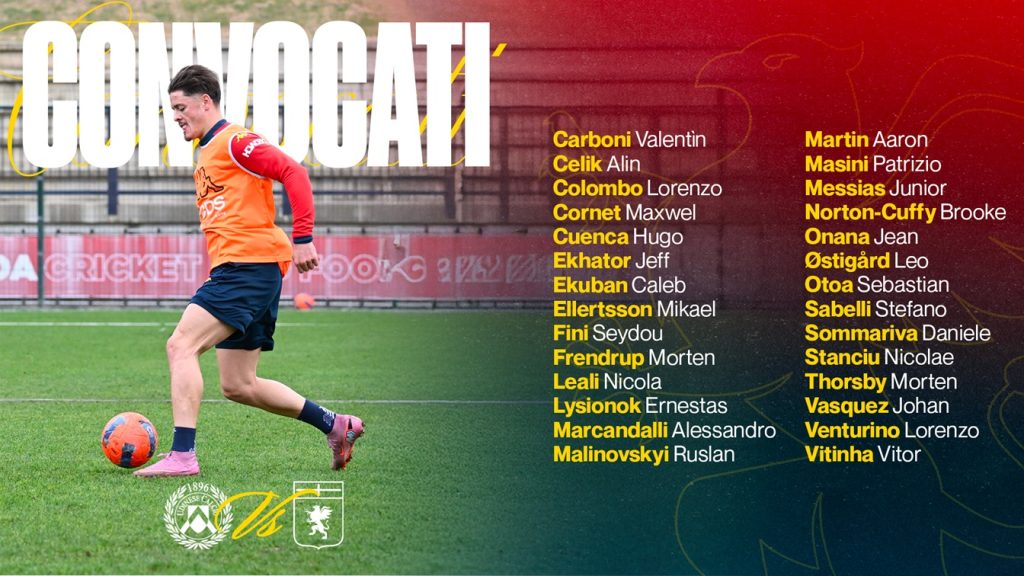 I calciatori selezionati dallo Staff Tecnico per la partita con l’Udinese, valida per la 14ma partita di Serie A Enilive 2025/26.