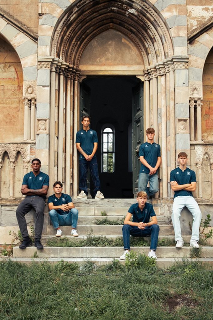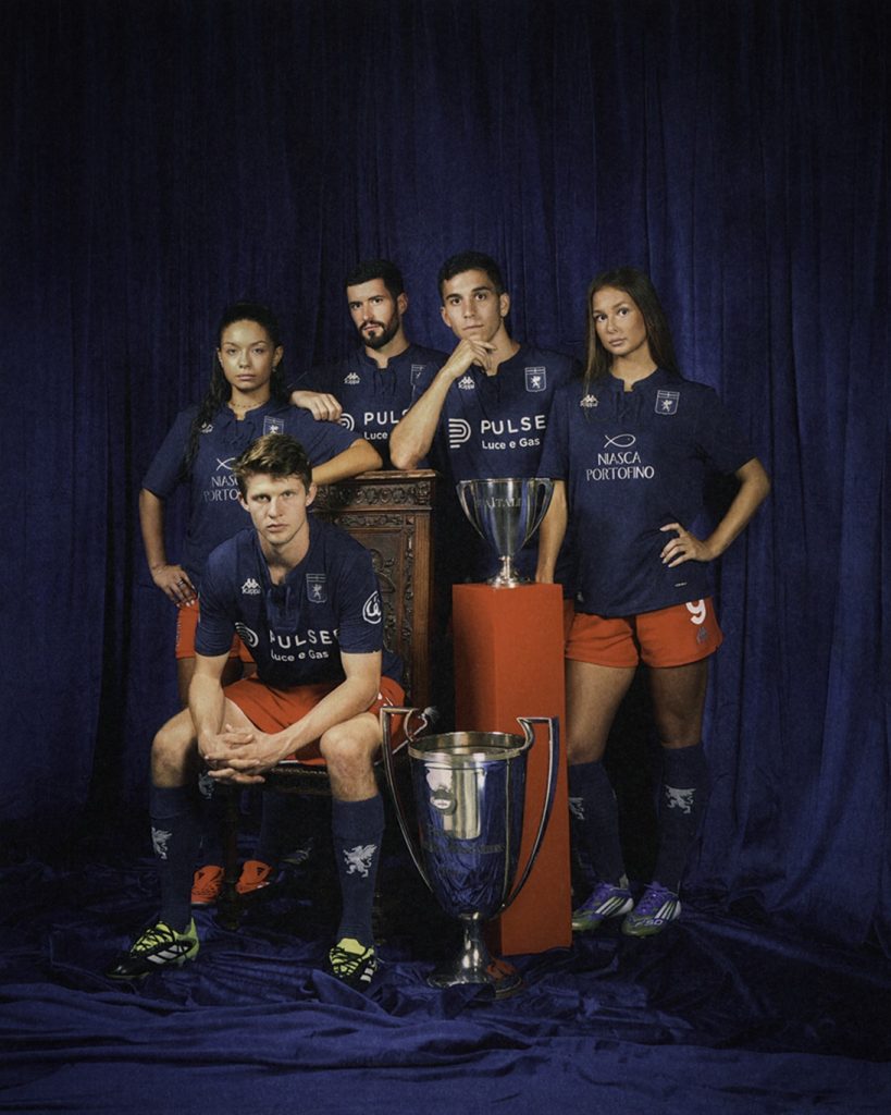 • Grifone in campo con terzo kit maglia blu e pantaloncini rossi da inno