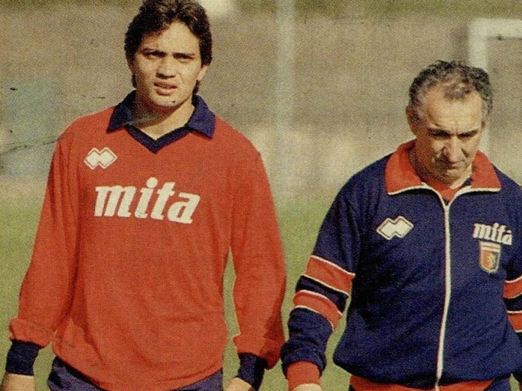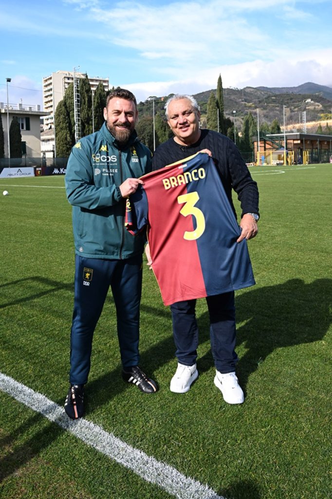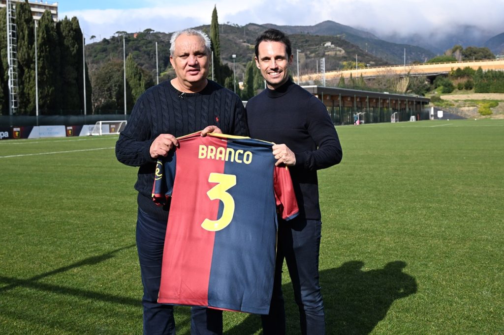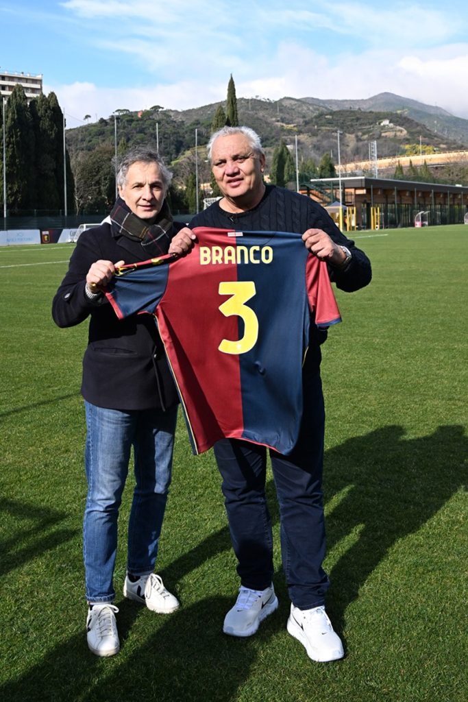 … la gente vuol sapere—-chi è quel brasiliano—-che gioca sulla fascia—-e tira da lontano—… Sono le 11:47 quando Claudio Ibrahim Branco, tre stagioni in rossoblù da incorniciare come quadri, varca i cancelli del centro sportivo intitolato a Gianluca Signorini. “Avessi guidato io, sarei arrivato all’una…”. L’ironia e l’allegria di sempre. Ad attenderlo Mario Bortolazzi e la rappresentanza del club. L’allenamento è in corso con DDR che si sta sgolando. Due ex da cartoline, Claudio e Mario, Mario e Claudio, autori di gol spettacolari da non credere. E artefici di annate straordinarie sotto la guida di Osvaldo Bagnoli. Un’occhiata ai campi di gioco: “Mario, guarda che bel tappeto sono ora i campi. Noi avevamo preso l’osso, qui adesso c’è da mangiare il filetto…”.