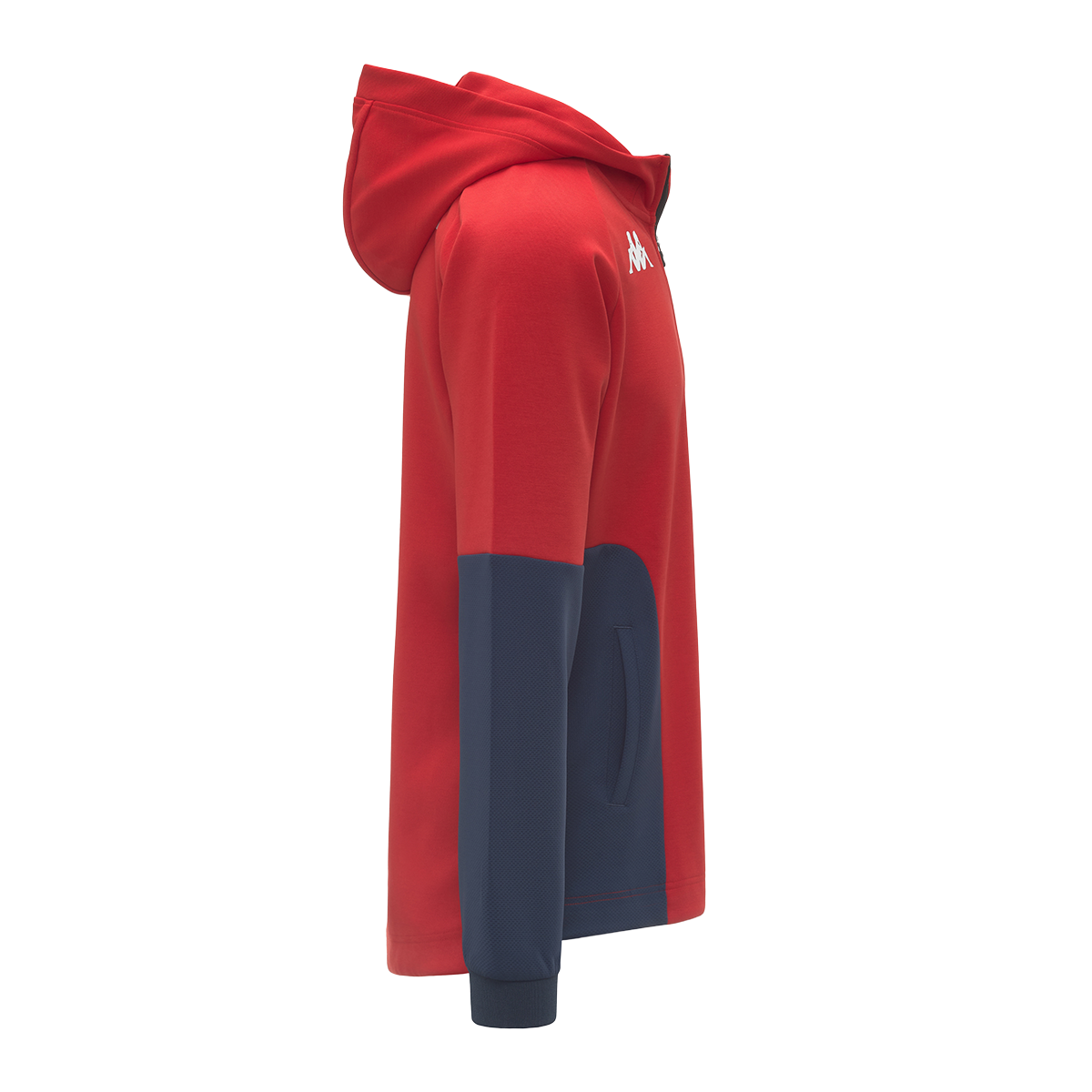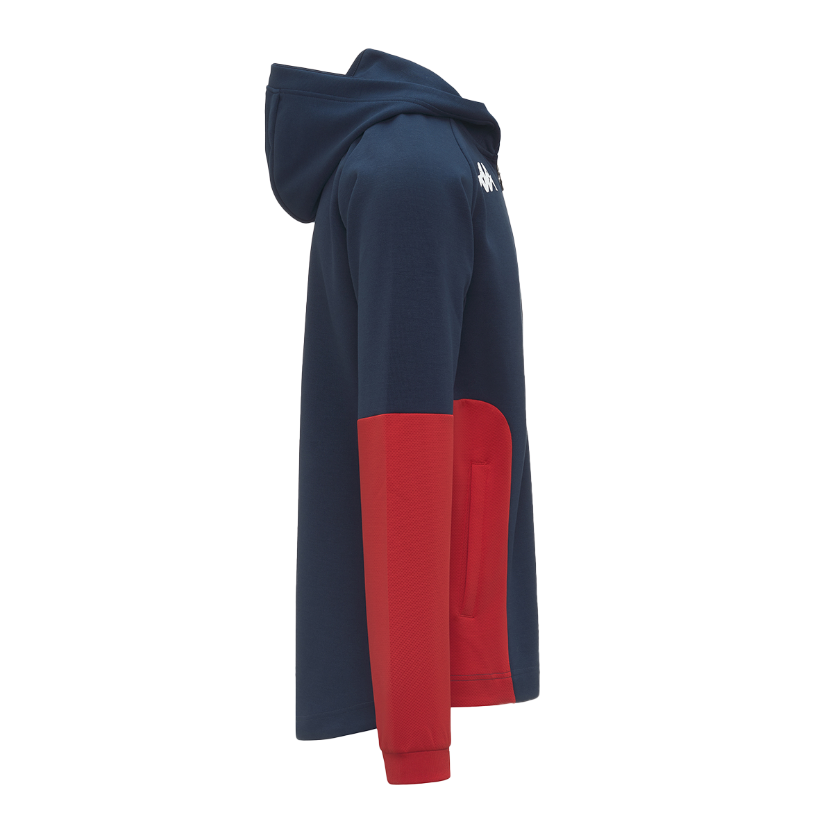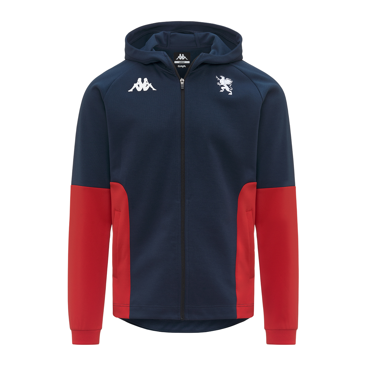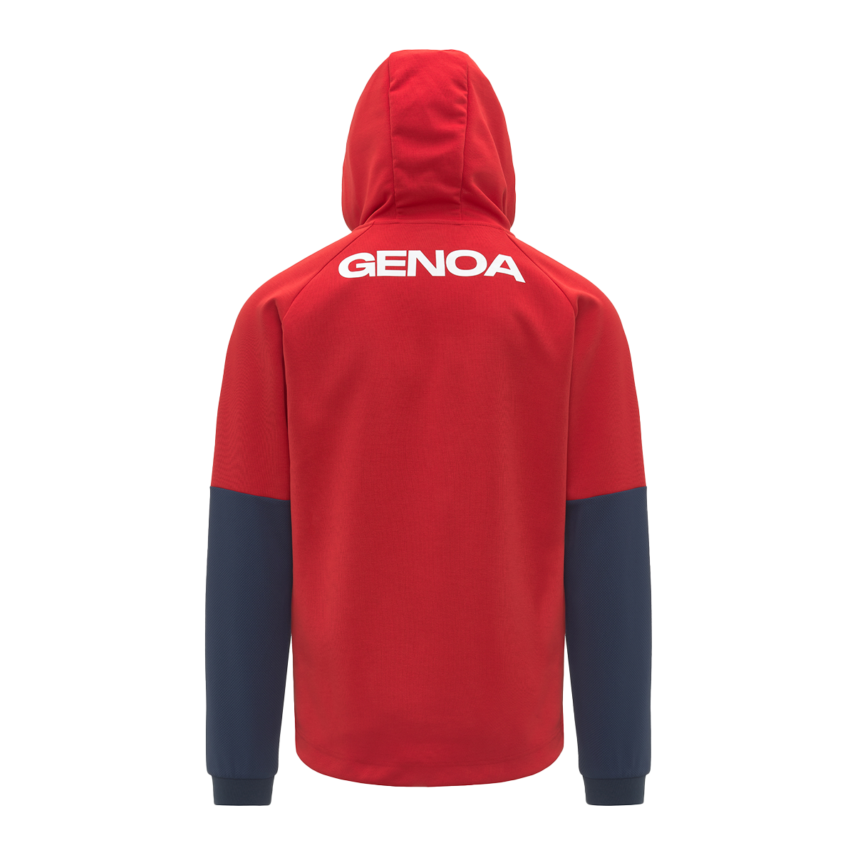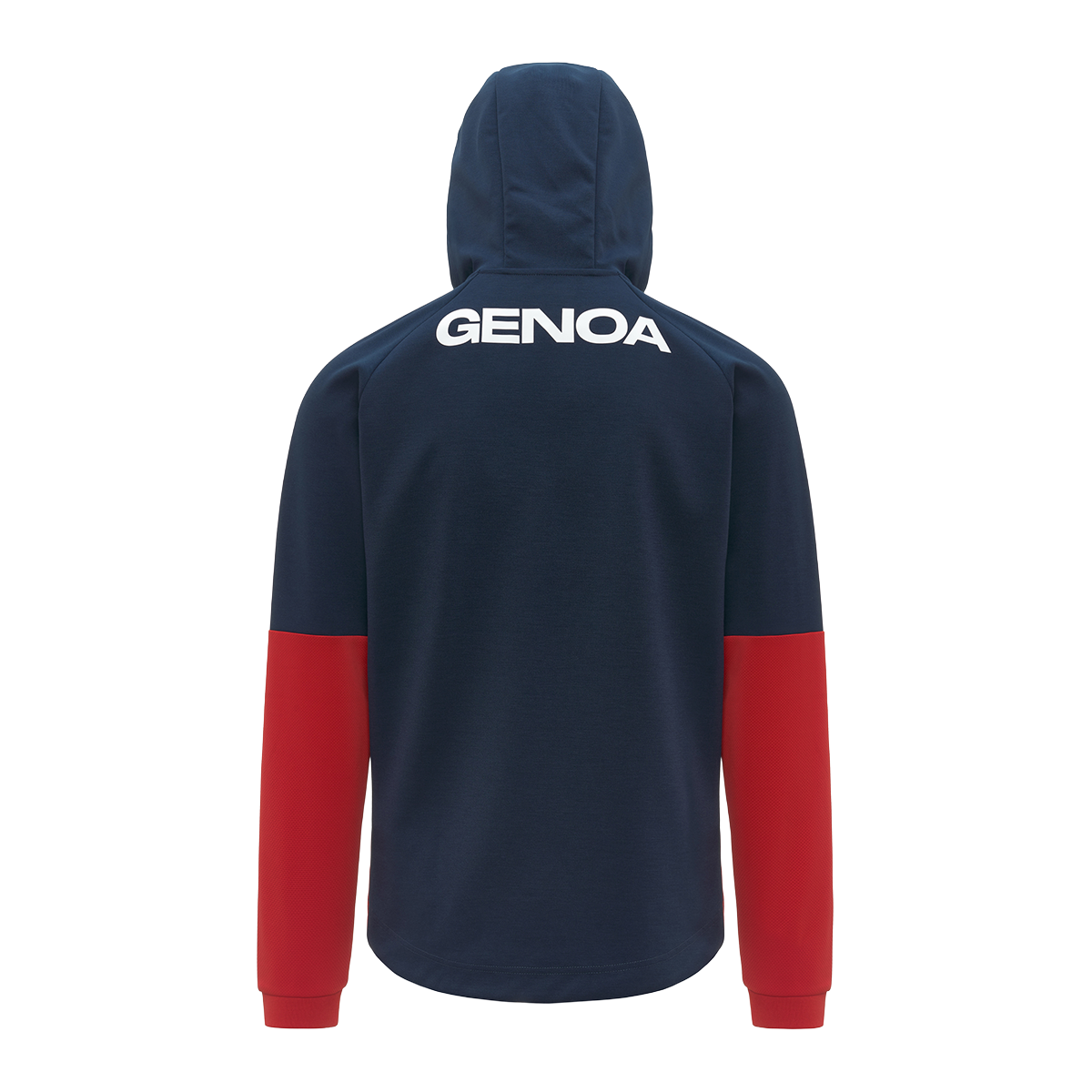 Con cappuccio, apertura zip intera, polsini con costina, tasche senza zip e inserti sul fronte e sul fondo maniche. Logo Omini sul petto realizzato in transfer applicato a caldo, logo Team ricamato sul fronte e lettering Genoa stampato sul retro.