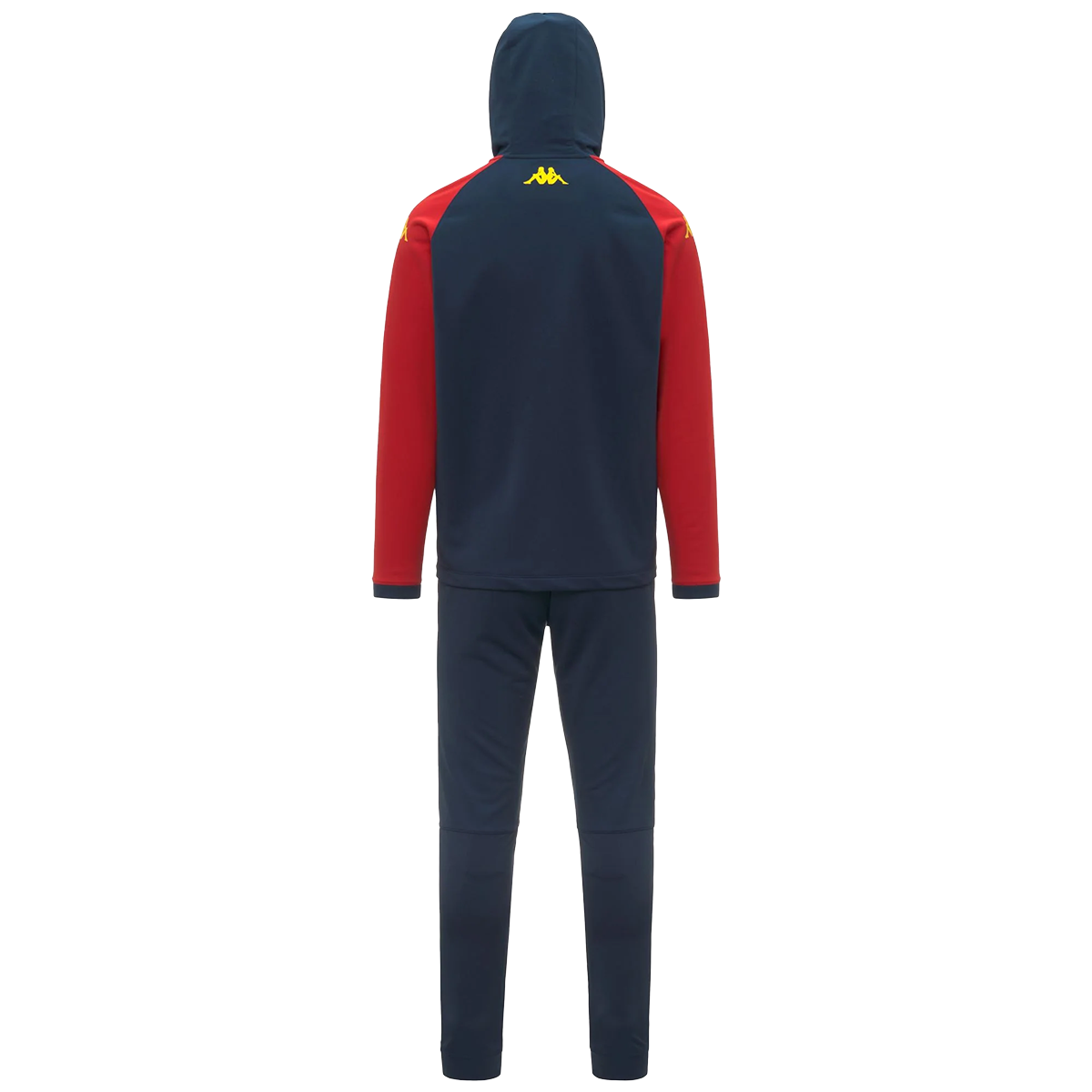 Felpa con cappuccio e apertura con zip davanti e tasche senza zip; pantaloni con elastico e coulisse in vita, tasche con zip e fondo con tessuto elastico. Logo Omini sul petto, sulle maniche, sul retro e sui fianchi realizzati in transfer applicato a caldo